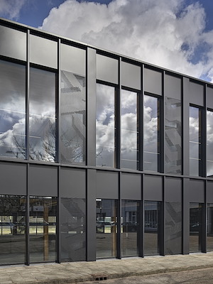 Kenmerkende ritmische gebouwstructuren van Buitenveldert vormden de inspiratiebron voor het gevelontwerp. Stoere zwarte aluminium panelen maken de achterliggende constructie leesbaar. Daarbinnen tekenen gevelvinnen met een fijne belijning de menselijke schaal. Geperforeerde panelen maskeren de draairamen en wie goed kijkt herkent een isometrie van het AUP. Deze bijzondere details en de strakke architectuur geven het gebouw betekenis en identiteit.