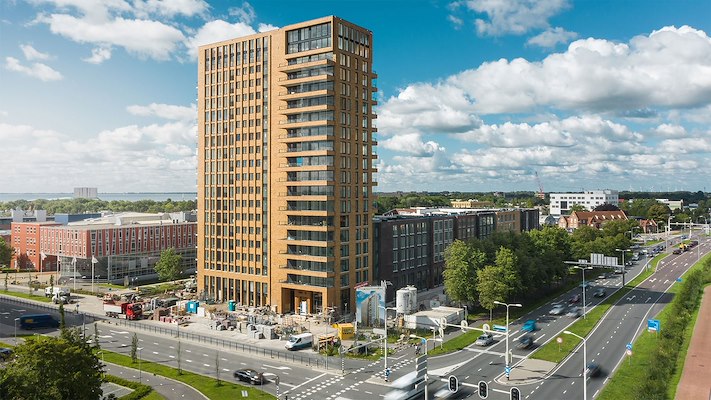De ‘laagbouw’ van 6 bouwlagen is ontkoppeld van de toren zelf, zodat de winddruk vanuit de zuidwestzijde voldoende ruimte heeft om te ‘ontsnappen’ en hinderlijke tocht bij de toren wordt beperkt.