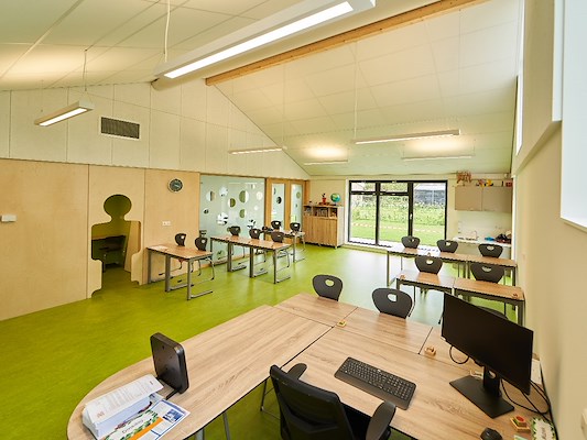 De boven- en onderbouw zijn gescheiden met daartussen als verbinding de aula en andere ondersteunende ruimten. Met onderwijsruimten aan weerszijden van de gang, is het daarom mogelijk om de gangzones kort en overzichtelijk te houden. Onderwijsruimten liggen aan de buitengevels en krijgen daardoor voldoende licht, de centraal gelegen ruimten worden voorzien van extra indirect daglicht vanuit openingen in de kapvorm.