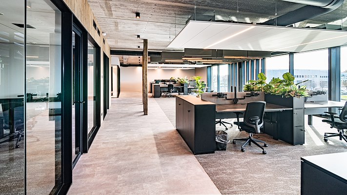 In de gevel zijn repeterende staanders toegepast, die door de houtkleur veel warmte geven. De houten accenten zijn in het interieur doorgevoerd. De kantoren hebben veel licht en uitzicht. Een industriële sfeer met een huiselijk karakter is als concept doorgevoerd in alle kleur- en materiaalkeuzes.