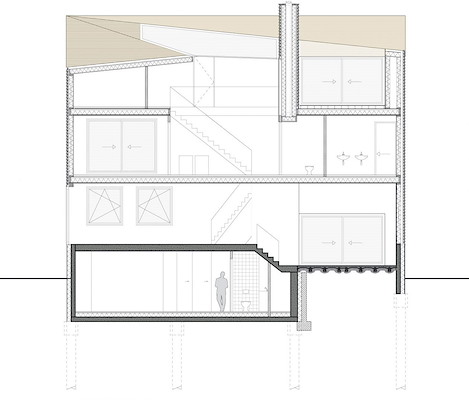 Door de verschillende richtingen in de plattegronden ontstaat een dynamische ruimtelijkheid. In het souterrain is een grote open entreeruimte met chill-/speelplek. Tegen de achterwand zijn bergruimten voor jassen, sportkleding, de hond en de was. Een schuine trap loopt naar de keuken op de begane grond. Een open haard ligt centraal tussen woonkamer en eetkeuken. Samen met de schuine trap naar de verdieping vormt de haard een sculptuur die de verder open woonvloer breekt. Vanuit de eetkeuken kan men langs twee kanten de woonkamer betreden, via een luie of een gewone trap.