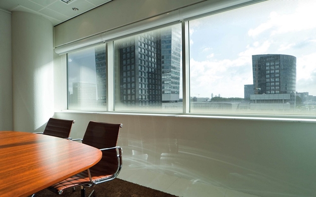 verdieping. Hier bevindt zich het vergadercentrum. Op de mooiste plek biedt een volledig witte lederen wandbank een prachtig uitzicht over Amsterdam.