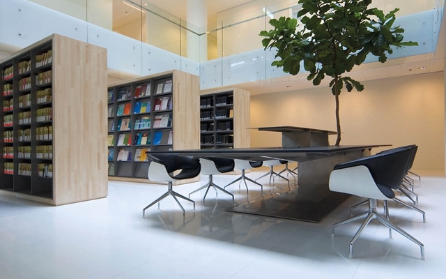 De bibliotheek kreeg bij Houthoff Buruma een centrale plaats en bevindt zich op de eerste verdieping. Ook hier zorgt een vijf verdiepingen hoge vide met glazen dak voor het nodige daglicht. De kunstcollectie van het kantoor, die met name bestaat uit grote werken, heeft vooral rondom deze vide, tegen de witte kernwanden, een plek gekregen. Leestafels met zwart lederen bladen en geïntegreerde boombakken zijn een steeds terugkerend element in het interieur, evenals roestvrij stalen balies.