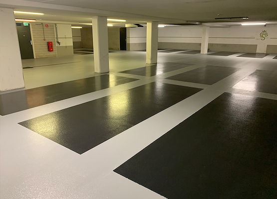 De ondergrondse parkeergarage bestaat uit twee verdiepingen: verdieping -1 en verdieping -2. Op -2 is er het risico op de belasting van grondwater. Op verdieping -1 was er sprake van flinke scheurvorming en belast een rooster de vloer doordat deze UV en regenwater doorlaat. Er zijn naast de verdiepingsvloeren ook twee hellingbanen aangepakt. Één hellingbaan ligt buiten dus wordt belast door weerinvloeden. Beide hellingbanen moeten een hoge mechanische belasting aan kunnen. Kortom: verschillende ondergronden met verschillende uitdagingen!