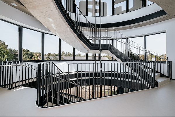The building’s heating and cooling systems only use renewable energy and thermal component activation. A brine heat pump and a photovoltaic system have been installed in the building, and the company also purchases green electricity. The façade also plays a significant role in energy efficiency: its large expanse of glass helps save on electricity for lighting and on heating in winter; in summer, external blinds and slats fixed on the upper storey protect against high temperatures.