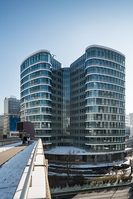 The canopy clad with ALUCOBOND® tray panels almost reaches the edge of the property and follows the bend in the road. Large skylights in the canopy allow daylight to penetrate into the ground floor. Built close to the edge, natural light is essential for this high office tower. Straight edged or curved? Both, of course. The Eria office tower in Paris would be totally out of keeping with Christian Portzamparc’s architecture had the architects opted for a simpler form. However, since the location, featuring a narrow plot of land with tricky lighting and traffic conditions, was anything but simple, neither is the high-rise, measuring almost 60-metres in height. As the architects wanted to make the most of this very narrow piece of land, they designed a semi-circular building and shifted it close to the edge of the plot. This resulted in 25,000 m² of floor space, distributed over 14 levels. The architects organised the fan-shaped layout to create one common heart connected to three petals. Separated by deep recesses, the three wings are ensured good natural light, have easily divisible floor plans, and circulation areas are kept to a minimum at the same time. The façade surface area is also increased, meaning more daylight and air is allowed into the interior of the building. Each building wing is rounded at the end and follows the fan-like, semi-circular line. However, on closer inspection, it becomes evident that these curved ends are actually a series of straight lines. The architects folded the glass façade into V-shaped oriel windows and in so doing increased the surface area of the frontage, the amount of natural light and the angles of incidence and reflection. As a result, light spreads widely and diffusely throughout the building. By mounting screw-on white bands onto the rounded floor slabs, the architects have emphasised their curves and the three-part tower features numerous sweeping curved lines which really highlight the angularity of the glass façade. An ALUCOBOND® clad canopy runs around the entire semi-circle and creates a visual separation between shops and cafés in the public space on ground-level and the private office accommodation on the floors above. At the same time, the canopy acts as a connecting element, linking shopping facilities and entrance with their surroundings; despite the constraints and inhospitable nature of urban space, passers-by and people walking through can enjoy a defined outdoor space where they are sheltered from the weather. Selecting straight edges or curves is, in this case, contingent on the specific construction task, the building plot and the resulting demands. The only feasible option here was to use both.