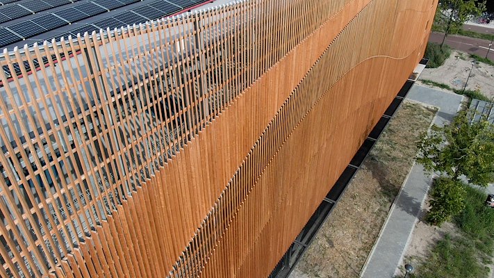 Naast genot voor het oog biedt deze prachtige parkeergarage parkeergelegenheid aan maar liefst 700 auto's bij het entreegebied van de campus in Leiden. Dit ontwerp van Wiegerinck Architecten Arnhem biedt een combinatie tussen parkeergelegenheid en een uiterst fraai design. Foreco heeft bij dit project in opdracht van Aan de Stegge / Continental Car Parks B.V. uit Twello circa 6.000 unieke lamellen geleverd voor de gevelbekleding. De lamellen zijn NE Grenen FRX, hebben verschillende schuintes en zijn op maat gekort.