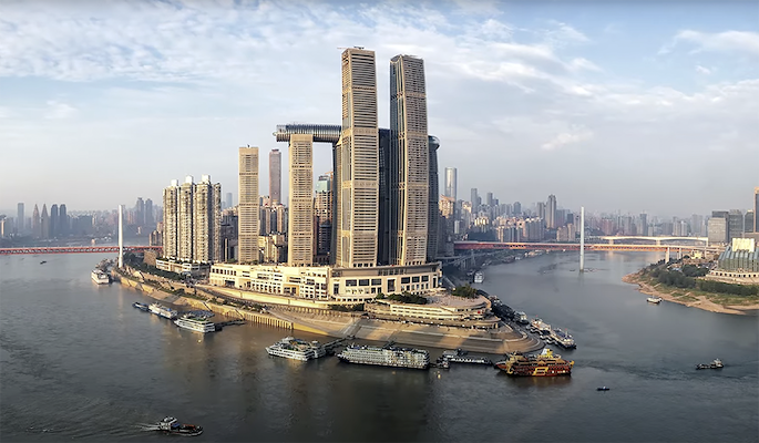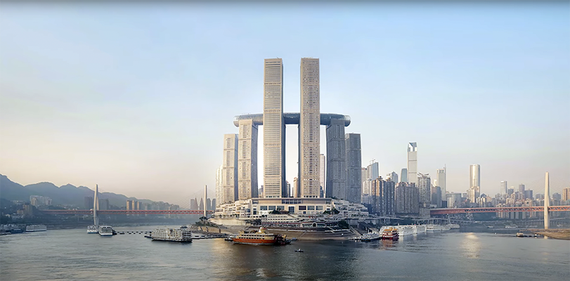 Chongqing, China. Een van de grootste steden ter wereld. Houd je adem in en juich Safdie Architects toe voor het ontwerpen van een monumentaal project op het schiereiland waar de rivieren Yangtze en Jialing samenkomen: Raffles City Chongqing.