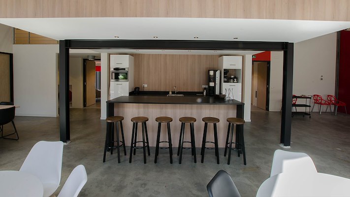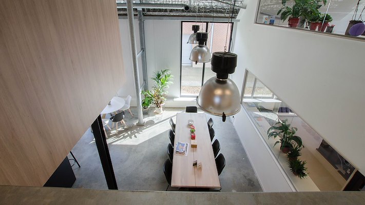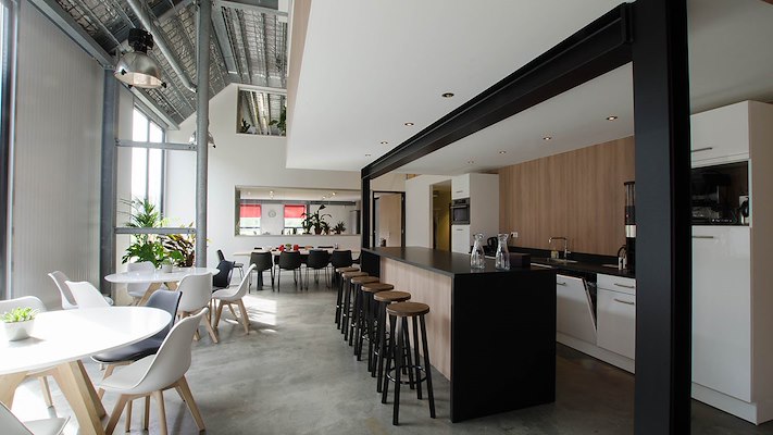 Door het volledig te strippen kwam de essentie van de structuur aan het licht: een homogeen raster van slanke, stalen kolommen, die een expressief metalen dak dragen. Op basis van dat raster hebben we de bestaande gevels doorbroken met grote ramen, die voor natuurlijk daglicht en doorkijkjes naar buiten zorgen. Het hart van dit gebouw wordt gevormd door de zwevende kubus, een ontmoetingsruimte die uitkijkt op de informele ontspanningsruimte en de open indeling van de begane grond.Door het volledig te strippen kwam de essentie van de structuur aan het licht: een homogeen raster van slanke, stalen kolommen, die een expressief metalen dak dragen. Op basis van dat raster hebben we de bestaande gevels doorbroken met grote ramen, die voor natuurlijk daglicht en doorkijkjes naar buiten zorgen. Het hart van dit gebouw wordt gevormd door de zwevende kubus, een ontmoetingsruimte die uitkijkt op de informele ontspanningsruimte en de open indeling van de begane grond.