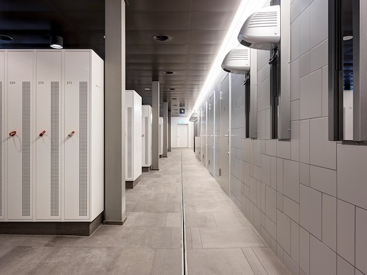 Deze flexibiliteit komt terug in de vormgeving van het gebouw. Zo is het plafond van het sportzwembad goud, de façade zilver en het kinderbad brons, de kleuren van de drie olympische medailles en daarmee een onmiskenbare knipoog naar het competitieve gebruik van het bad. Als contrast weerspiegelen de vloer en de wanden juist het speelse, recreatieve karakter van het zwembad, met een warm en ingetogen kleurenpalet. Dankzij de natuurlijke tinten hebben de vloer en wanden geen uitgesproken sportieve, maar eerder luxueuze uitstraling. De keuze van het vloermateriaal was erg belangrijk. Enerzijds moest de vloer voldoen aan de DIN-norm voor slipweerstand en anderzijds moest het materiaal zowel geschikt zijn voor de natte gebieden rond de baden als droge gebieden waar schoeisel wordt gedragen. Lehmann liet zijn keuze vallen op de tegels van Mosa. “De Mosa-tegels zijn zowel wat materiaal als vormgeving betreft van hoge kwaliteit. Ik vind ze gewoonweg geweldig.”
