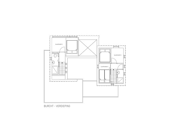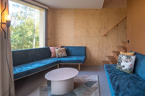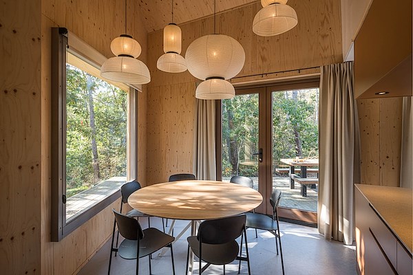 Boshuis Burcht keert zich juist naar binnen toe. De gesloten voorkant geeft niet direct alles prijs, de verrassing komt wanneer je binnengaat en direct de patio inkijkt waarop alle leefruimtes gericht zijn. Door de smalle ‘schietgaatjes’ als ramen vang je vanaf binnen telkens slechts een glimp op van het bos, waarbij grote daklichten toch voor veel lichtinval zorgen. Kenmerkend is de schakeling van verschillende buitenruimtes, van de besloten patio naar een overdekte veranda tot het terras dat met punt het bos in steekt. Met de grote lounge, keuken met bar en knusse eethoek is dit een ideaal huisje voor quality time met vrienden of familie.