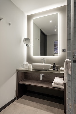 Het ontwerp van het hotel en de keuze voor dessins valt allemaal samen met het thema water. Het is een directe link met het waterstelsel waar Den Bosch bekend om is. Het ontwerp en het interieur van het hotel is tot stand gekomen door een goede samenwerking tussen Vastgoedeigenaar Build to Built, HDVL Designmakers en HIP Studio voor het interieurontwerp en HomrisB8 voor het meubelontwerp. Overal in het hotel zie je de vloeiende lijnen en organische vormen van water terug. Zoals op het folie op de ramen en in de prachtige kleurkeuzes in blauwe en groene tinten. Zowel in de openbare ruimtes als in de stijlvolle kamers en suites sluiten de kleuren en vormen naadloos op elkaar aan. Tot in detail voorzien van de meest kwalitatieve afwerking en hoogwaardige materialen. Zo is gekozen voor de kwaliteit en het moderne design van Duravit voor de stijlvolle badkamers en openbare toiletruimtes. De Duravit producten die zijn toegepast zijn het toilet uit de Architect serie, de Foster opbouwkommen en de Duravit C.1 kranen en douches.