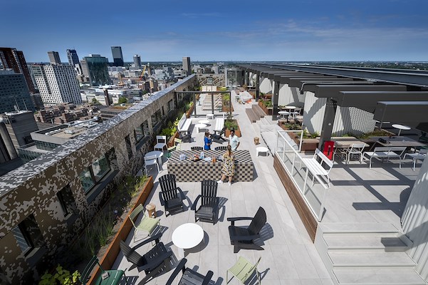 In dit woonconcept staat elkaar ontmoeten centraal. Zoals Greystar zegt: “Het is een aantrekkelijke hoogstedelijke woonbeleving voor een periode van 5–7 jaar in je jonge leven. Je kunt hier prima toe met minder vierkante meters vanwege de grote hoeveelheid gedeelde ruimtes (bron: PropertyNL).” Met gemeenschappelijke lounges, koffiebars, fitness en services is het hier helemaal op ingericht. En het dak is daar onderdeel van. Chillen, dineren of feesten met fantastisch uitzicht op Rotterdam!