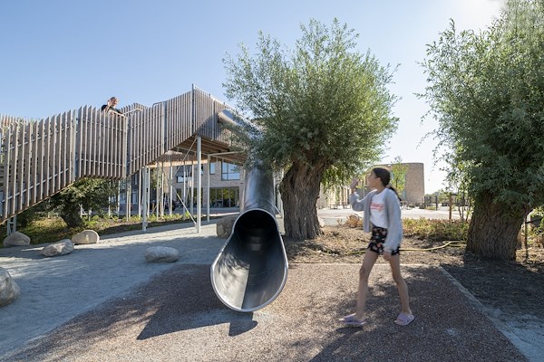 De verdiepingen zijn (ook) met elkaar verbonden door een spannend speelhuis en het gebouw bevat verschillende binnenpleinen.