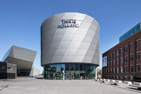 Het plein aan het Paviljoen This is Holland is een stedelijke ruimte die wordt geflankeerd door A’DAM en het Grootlab-gebouw. De attractie van TiH bevindt zich op de verdiepingen achter de gesloten gevel. Door het ‘dichte programma’ als het ware 6 meter op te tillen kunnen de entree en het café op de begane grond worden gerealiseerd, achter een glazen gevel. Vanaf het plein zijn de bezoekers van TiH zichtbaar, die op omloop op de 1e verdieping wachten om de attractie binnen te gaan. Een glazen gevel met publieke functies draagt bij aan de levendigheid en het open karakter van het plein. Het zorgt ervoor dat de Tolhuistuin en het nieuwe stadspark zoveel mogelijk visueel met elkaar verbonden blijven. Bovendien sluit de hoge glazen gevel aan bij het stedebouwkundige uitgangspunt voor 6m hoge transparante plinten voor de gebouwen in De Strip.