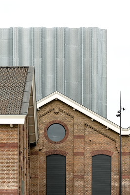 Het strekmetalen gordijn steekt stoer boven het klassieke industriële pand uit. Het aluminium werd geanodiseerd, wat een intense beleving van het metaal geeft. Dit zorgt voor een rijke kleurschakering in de volle zon: door de reflecties zie je bij elke zonnestand weer andere kleuren en patronen in het metalen oppervlak .