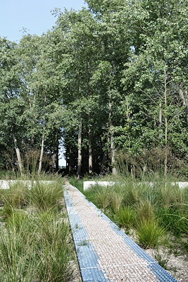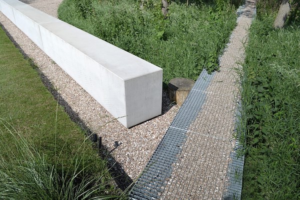 Een strakke lange stalen lijn markeert het hoogteverschil en de overgang van gazon (lees: weide) en het bosdeel. De lange muur bestaat uit een massief blok, dat subtiel lijkt te zweven boven de bosvloer. De verfijning in dit soort stevige en krachtige gebaren is van cruciaal belang. In dit geval zit de verfijning in het licht laten zweven van het totale object en met name in de karakteristieke gezandstraalde grafiek ontworpen door Studio BLAD.Deze tekening suggereert beweging en verwijst naar het bewegen van zandlichamen in de duinen en dicht bij de zee. De tekening is ook terug te vinden in de kerende muur langs de oprit.