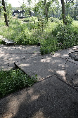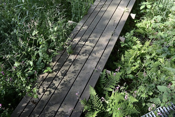Wat deze tuin nog meer bijzonder maakt is dat hij op een subtiele landschappelijke overgang ligt van de hogere zandgronden naar de lagere veenweiden, welke onderdeel zijn van het achterland.Op het iets hogere en drogere deel groeide een bepaalde vegetatie, maar kenmerkend is dat in het lagere, nattere deel een elzenbos is ontstaan. Deze overgang was zichtbaar en beleefbaar op de kavel, maar niet heel sterk. Dit verhaal in het landschap is in het ontwerp geactiveerd en versterkt. Een prominente diagonale lijn markeert de boslijn en verdraait je oriëntatie nog meer naar het omringende landschap. Deze diagonale lijn in het ontwerp doet de tuin tevens nog groter lijken dan hij al is.