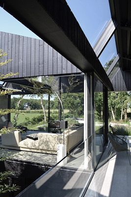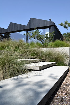 Zoals gezegd is de hele woning opgetild boven het landschap en ligt ze op een terp. De woning komt bijna los van zijn omgeving. Deze suggestie van loskomen is versterkt door vrijwel de hele woning in een veld van grassen te zetten. De monoliet van zwart staal, zwart gebeitst hout en grote spiegelende raampartijen die de lucht pakken, ligt in een zacht kussen van siergrassen die door het seizoen voortdurend verandert van kleur, textuur en volume en het weer vangt. Gefilterd licht in de avond, de dauw in de vroege morgen, de wind op een onstuimige dag en de rijp in de winter. Ze worden gevangen in dit veld van grassen en vertellen je een poëtisch verhaal dat je onderdeel bent van het landschap.