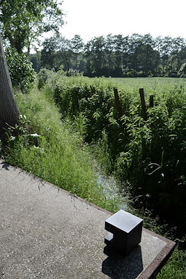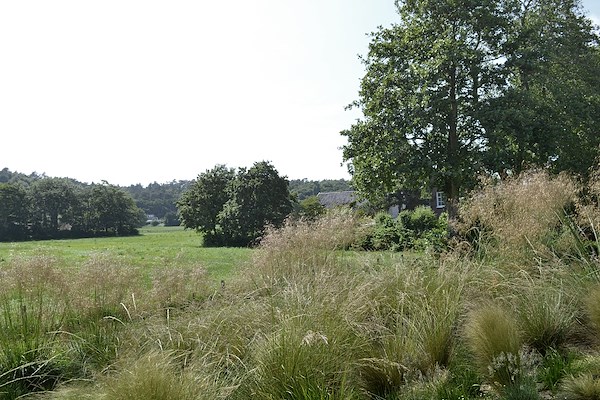 De plek doet bijna on-Nederlands aan. De hoogte van het duin geeft de beleving van een heuvellandschap. En het licht van de zon die in de avond over de donkere bos-façade op de hoge duin prikt geeft een magische beleving die elke landschappelijke kamer oplicht. Deze tuin ligt ook in zo’n kamer. Als enige woning in de omgeving ligt deze op een terp. Vanuit de woonkeuken en de woonkamer word je letterlijk opgetild boven het landschap. De link met het landschap is uiteraard weer een belangrijke in dit werk. Vanuit het huis zorgen lange zichtlijnen, coulissen in de tuin, verdraaiingen in de oriëntatie en de werking van licht en donker voor een sterke binding met het omringende landschap. Vanuit de woonkamer kijkend houdt de tuin niet op bij de erfgrens, maar loopt als vanzelf door in het weiland ernaast. De enige scheiding is een smalle greppel met hier en daar een els.Het kenmerkende elzenbos loopt door in het bos van de buurkavel, zonder dat er enige erfscheiding aanwezig is.