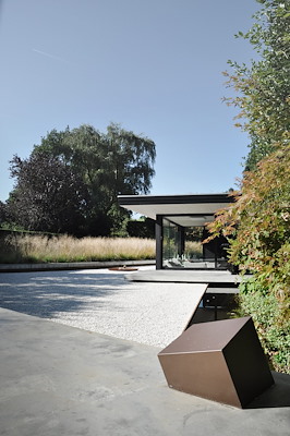 Het paviljoen is in de verdieping naar beneden geduwd, dus het is niet te dominant. Hierdoor wordt de ruimte niet opgevuld en wordt de visuele verbinding met het omringende groen gegarandeerd.De zone van grind omlijst door de zwevende betonnen randen is de moderne vertaling van een zwembad. Een vlak zonder water, welke dient als display voor het paviljoen. De gebruikte materialen in het paviljoen verwijzen naar de historische architectuur van deze regio. Zwart gebeitste houten planken, zoals gebruikt in oude schapenstallen, worden op een eigentijdse manier teruggebracht.