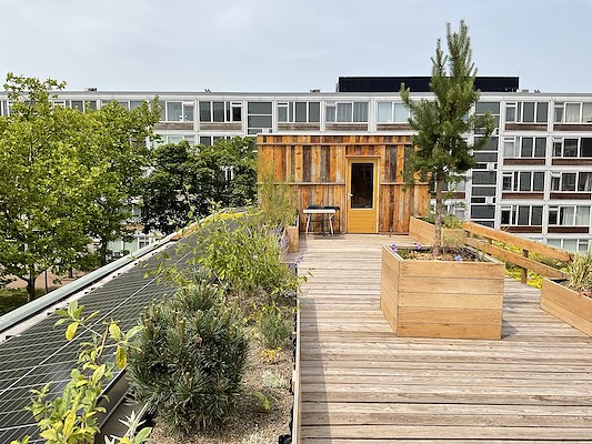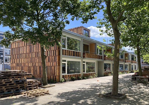In opdracht van woongroep Overhoop heeft M’n Architect het ontwerp gemaakt voor de circulaire renovatie en transformatie van een woon- en winkelgebouw aan de Camera Obscuradreef in de wijk Overvecht in Utrecht. De leegstaande winkelpanden zijn deels verbouwd tot woningen en bieden in de gewijzigde situatie plaats aan een buurthuis en een weggeefwinkel.