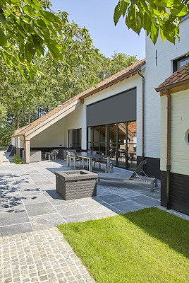 “Woning C is een zeer goed voorbeeld van hoe in een eerder klassiek gebouw screens ook esthetisch en succesvol kunnen geïntegreerd worden. Dit gebouw voorheen bestond uit een kakafonie van kleine ruimtes. Dat hebben we opengetrokken; er werd volume gecreëerd onder de kap. De oorspronkelijk kleine ramen hebben we ook groter en verticaal gemaakt, met een klassieke touch. De bouwheer hebben we kunnen overtuigen om gebruik te maken van de zonwering. De combinatie doet geen afbreuk aan de charme en de stijl van deze typische Vlaamse hoeve. Woning C toont mooi aan hoe een oorspronkelijk ‘donkere’ en gesloten architectuur werd opengebroken met respect voor de historische verschijningsvorm én toch comfortabel leefbaar blijft met dank aan de screens. Wij hebben al die zaken verzoend in dit project.”
