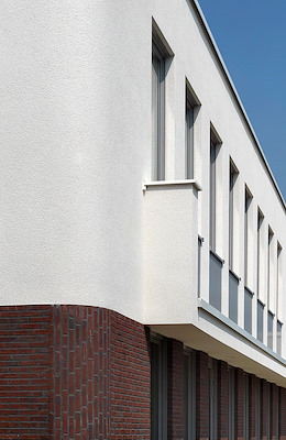 Van het bestaande schoolgebouw zijn de bakstenen gevels gehandhaafd en zijn de vernieuwde luifels voorzien van wit stucwerk. In de nieuwbouw zijn dezelfde materialen toegepast maar is de balans tussen de materialen omgedraaid en is het witte stucwerk dominant ten opzichte van het metselwerk in de plint.