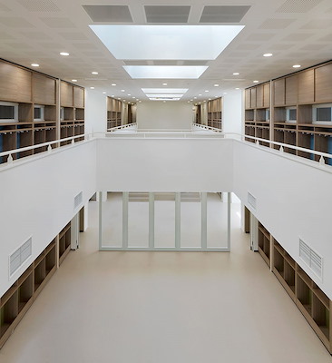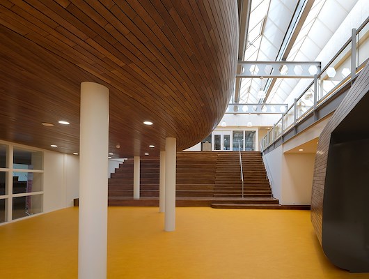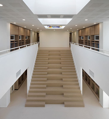 De aula, de bibliotheek en de docentenruimte worden gedeeld door alle scholen. Het algemene ontmoetingsplein verbindt alle gebruikers en is er voor alle gebruikers. Hier bevinden zich tevens de brede tribunetrappen.