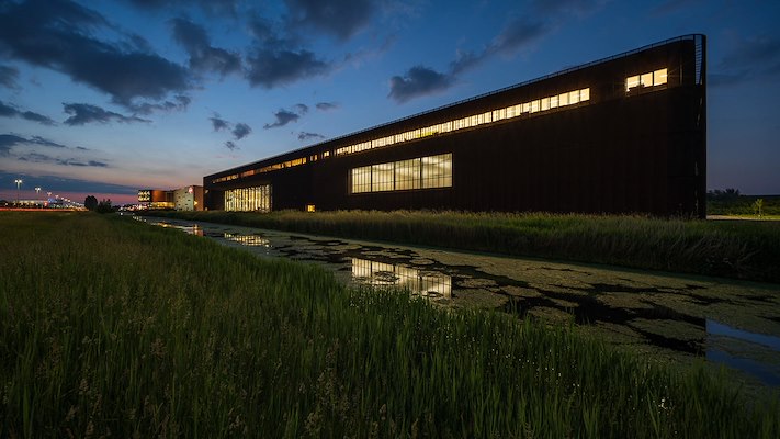 In deze Corten stalen voile is een groot venster geplaatst, die vanaf de snelweg een blik geeft in de gehuisveste organisatie. Dit venster krijgt kracht door een negge met een diepte van 5 meter. De architectuur van dit pand langs de snelweg is daardoor eenvoudig, helder en eenduidig. De gevel van strekmetaal is als een huid rond het gebouw getrokken op 60cm van een eenvoudige bouwkundige gevel. Tevens is dit servicestrook. Om dit beeld te versterken zijn de gebouwhoeken rond ontworpen. Eén fysieke eigenschap van strekmetaal bij geveltoepassing is dat het gebouw vanuit het exterieur gesloten lijkt, terwijl vanuit het interieur de omgeving duidelijk zichtbaar blijft. Door de toepassing van strekmetaal is er geen additionele zonwering noodzakelijk en zorgt dat er geen warmtelast is bij helder weer. Onderhoud aan deze gevel is niet noodzakelijk. Cor-Ten-Staal is onderhoudsvrij. Het uiterlijk is door de materiaaltoepassing industrieel en sluit aan bij het beeld wat opdrachtgever nastreeft.