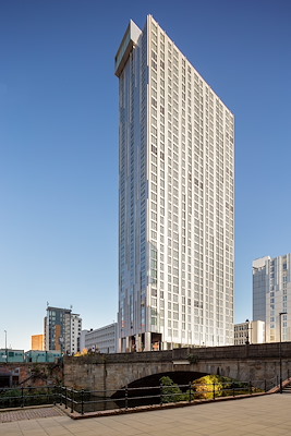 The slender, soaring residential tower has turned out just as the architects Denton Corker Marshall intended: it is a modernist utopia. The architects’ residential tower, Trinity Riverview, extends bold and high above the Mancunian rooftops. The name Riverview is a real understatement, because the view offered by the 100-metre tower is far more extensive than just the river meandering past below it. Manchester is upwardly mobile and, thanks to economic structural change, it has become an important location not only for international finance and technology but also for the service and creative industries. The city is undergoing densification, especially at its bustling centre. Anyone finding a plot of land suitable for development alongside the river, will endeavour to make the most of the space. The architects of Trinity Riverview have succeeded in making a landmark statement with their structure which also stands on a narrow plot of land. They have recessed the base at the narrow end of this residential building, added a glass frontage and columns enveloped in ALUCOBOND®. The façade covering the reinforced concrete frame structure is a classic, strict grid format with clearly perceptible floor/ceiling slabs. Full length ALUCOBOND® tray panels and floor-to-ceiling windows form vertical bands, which extend up the long façade, enhancing the height of the building. Raised strips of varying lengths are placed along the vertical seams, emphasizing the upward movement of the tower. The architects combined naturAL Line, Silver Metallic, Grey Metallic and Black ALUCOBOND® with glass and defined the building using only the folds, seams and gloss levels of the façade. Depending on your perspective, the slender oblong or tower seems even taller and appears to merge with the clouds when the sky is a cloudy Manchester grey.