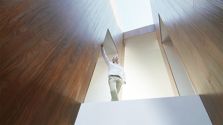 Je vervolgt je reis naar een donkerdere ruimte, waar je je jas ophangt. Licht begeleidt de reis verder en leidt je letterlijk naar het hart van het huis. Daar openen de muren zich en treedt het landschap binnen. Je geeft je over en ziet de natuur zoals je die nog nooit eerder hebt gezien.
