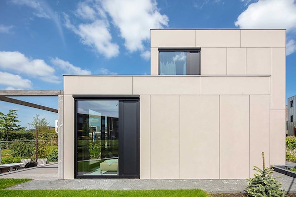De kubuswoning heeft grote verdiepingshoge ramen die zorgen voor veel daglicht en uitzicht naar buiten. Hierdoor voelt de woning heel ruimtelijk aan. De ramen hebben geïntegreerd aluminium luiken, die naar binnen toe met een kiepstand te openen zijn, om de woning te voorzien van frisse lucht van buiten. De mat zwart aluminium kozijnen zijn vlak in de gevel aangebracht, zonder negge, in hetzelfde vlak als de beigekleurige Eternit gevelbekleding. Hierdoor ontstaat een sterk contrast, zowel in materiaal als in kleur. De entree van de woning is in de voorgevel geplaatst en heeft wel een negge zodat deze duidelijk herkenbaar is.