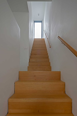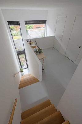 Om veel licht en ruimtelijkheid te creëren is een watervaltrap ontworpen van twee rechte steektrappen achter elkaar. De eikenhouten trap begint aan de achterkant in de woonkamer, en eindigt aan de voorkant in de overloop van de hoofdslaapkamer op de 2e verdieping. Dit was net mogelijk met de maximaal te bebouwen diepte van 10m. Het grote trapgat dat hierdoor ontstaat en de vide die hieraan is verbonden, geeft het beoogde licht en de ruimtelijkheid aan de woning.
