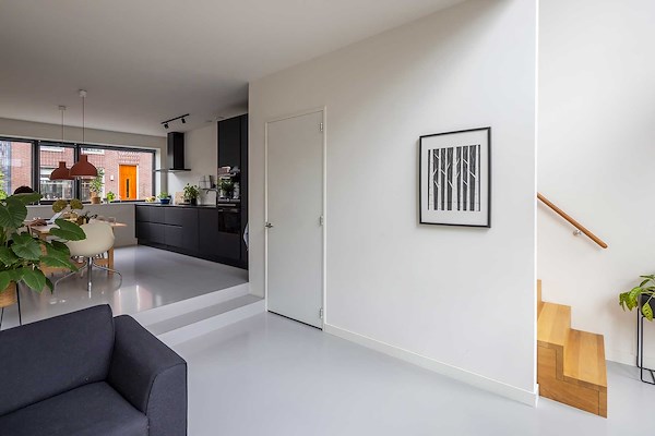 De open keuken die aan de voorkant naast de entree van de woning ligt, is met twee traptreden verhoogd en wordt hierdoor ruimtelijk gescheiden van de woonkamer. Tegelijkertijd geeft de verhoging meer privacy in de keuken vanaf de straat en verbindt deze de woning met de verplichtte Delftse stoep.