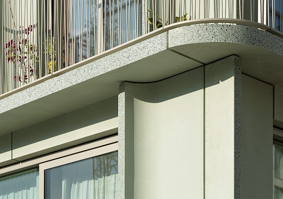 De heldere architectuur wordt versterkt door de toepassing van één enkel materiaal: lichtgroen beton. Het lijnenspel tussen de horizontale banden en penanten van het zachtgroene materiaal onderscheidt De Jakoba verder van de omliggende gebouwen. Doordat de smalle uiteindes van de groene betonpanelen in één beweging konden worden gepolijst, hebben we op een eenvoudige manier de gevels een aantrekkelijke detaillering kunnen geven. De materialisatie wordt verrijkt met kozijnen en balustrades met een poedercoating in zilvergoud, die een warme gloed toevoegen. De subtiel gebogen pijlers creëren een wisselend spel van licht en schaduw gedurende de dag.