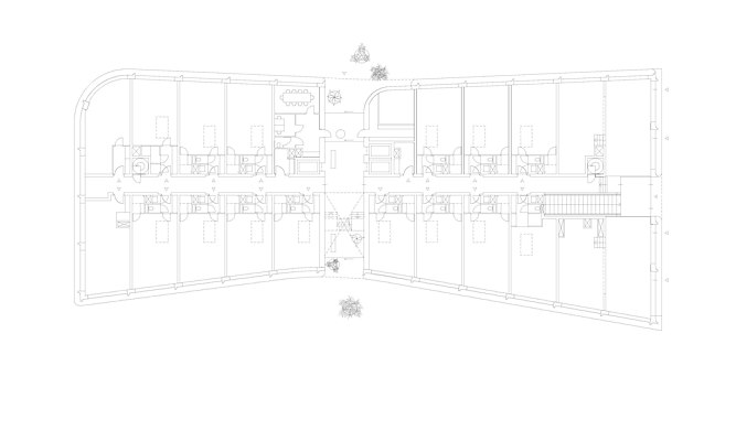 Vanwege de sculpturale vorm van het gebouw heeft elk van de 135 studiowoningen een unieke indeling. In het hart, het smalste deel van het gebouw, ligt de entreepassage die de open gemeenschappelijke tuin met de straat verbindt. Doordat het gebouw naar binnen buigt, omarmt het de tuin en creëert het een gevoel van beschutting. De tuin en de hoge multifunctionele ruimtes op de begane grond langs de Docklandsweg brengen nieuwe levendigheid op straatniveau.