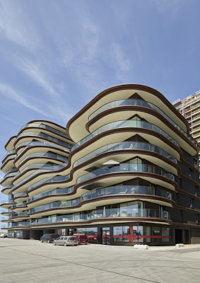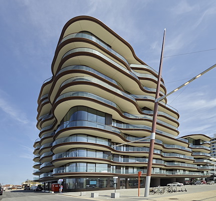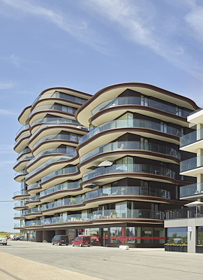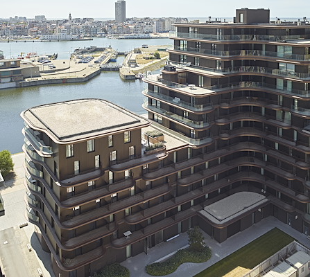 “Voor dit dossier moesten wij op planbasis niet in detail treden, wat ons toeliet om de focus 100% op de buitenkant te leggen. De luxeappartementen zijn groot en Versluys wist dat ze op planbasis, op die ligging, al een verkoopbaar project hadden. Alleen hebben zij niet de expertise om grensverleggende gevels te ontwerpen. Vandaar dat ze bij ons aanklopten. De gevel weerspiegelt het karakter van de site, havengebied en kust. De terrassen met hun expressieve terrasranden geven het complex een unieke uitstraling en maritiem karakter. De glooiingen van het gebouw gaan mee met het golvende karakter van het voorliggende duinlandschap en de zee. Golvende doorlopende glazen balustrades reflecteren licht, lucht en water.”