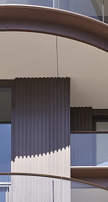 Ook de materialisering van One Baelskaai verwijst naar het omringende duinlandschap. De geprofileerde, verticale Linarte gevelbekleding van Renson evoceert het beeld van de duinen. Alhoewel Linarte de mogelijkheid tot eindeloze personalisatie biedt met toevoeging van houten of led inserts, koos de architect hier voor de pure en strakke look. “Het inzetten van Linarte werd niet zomaar op één dag beslist. De werf zat in ruwbouw al op niveau +3 toen het Renson product ‘in the picture’ kwam. Wij als architect hadden wel al gezegd dat wij een verticaal geprofileerde gevel wilden die knipoogde naar het duingras en de houten paaltjes met ijzerdraad die de duinen afbakenen. Die subtiele verticale verwijzing in onze gevel contrasteert mooi met de horizontaal glooiende terrasboorden. Welk materiaal dat precies moest worden, daar waren wij en Versluys niet meteen uit. Aluminium was wel al van in het begin een optie maar we keken ook naar andere materialen.”