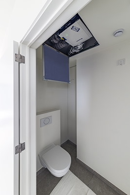 Dat ‘ontzorgen’ ook op het vlak van gezonde binnenlucht een belangrijk thema was in dit nieuwbouwproject, blijkt uit de keuze voor het vraaggestuurde of ‘Smartzone’ C+ ventilatiesysteem. De Healthbox 3.0 regelt er als centrale ventilatie-unit per appartement de afvoer van vervuilde binnenlucht per ruimte. Dat betekent dat die enkel meer gaat ventileren in die kamers waar hij – op basis van continue metingen via detectoren per ruimte – een verhoging van het CO2-, vocht- of geurtjesgehalte detecteert in de binnenlucht. “Vooral de bouwheer had goede ervaringen met dit systeem,” weet Lemmens, “en dat gaf de doorslag voor deze keuze. “Uiteraard speelden de goede resultaten van vraaggestuurd ventileren op epb-gebied en dus ook op de verbruikskosten daarbij een grote rol, net zoals de beperkte afmetingen van de box en het feit dat er sprake is van een enkelvoudig luchtkanalensysteem. In de kleine bergingen was namelijk geen plaats voor een mastodont van een ventilatie-unit. Met de Healthbox tegen het plafond gemonteerd neemt die zelfs helemaal geen ander benutbare plaats in.”
