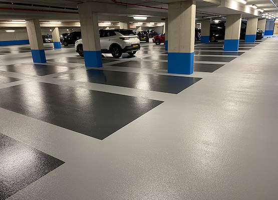 heeft de systemen in de parkeergarage aangebracht. Allereerst moest er geschuurd worden, en de ondergrond gerepareerd worden waar nodig. Vervolgens werd de slijtlaat aangebracht, waarna deze werd ingestrooid. Ten slotte werd een finishlaag aangebracht in de gewenste uitstraling en kleur.