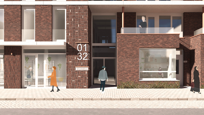 Het nieuwe woongebouw op de kop van de Slotermeerlaan markeert de entree naar de vernieuwde Nieuwenhuysenbuurt. Het ontwerp biedt ruimte voor ontmoeting, spelen en groen en zoekt daarbij steeds de interactie op tussen binnen en buiten. De woningen en bedrijven in de plint dragen bij aan de levendigheid op straat en de groene omgevingskwaliteit wordt doorgezet in de architectuur van het gebouw.