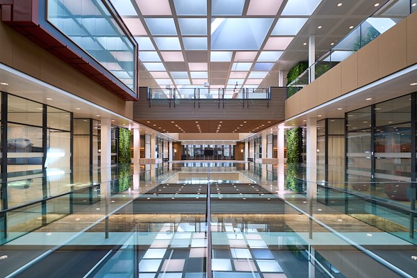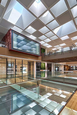 Het patroon van de lichtkappen is geïnspireerd op de aanwezige wandreliëfs van Henk van der Plas en op het werk van Jan Schoonhoven. Het resultaat is een compositie van Hollands licht, met hemel, direct en indirect licht en reflecties. Wie naar boven kijkt ziet een collage van voorbij drijvende wolken, als een levens schilderij. De dichte delen van het raster zijn LED-vlakken, die ’s avonds zorgen voor een omgekeerd effect. Zorgvuldig ontworpen details brengen contrasten aan tussen beton, hout, glas, natuursteen en metaal. Dit alles versterkt door het spel van daglicht dat nu overal voelbaar is.