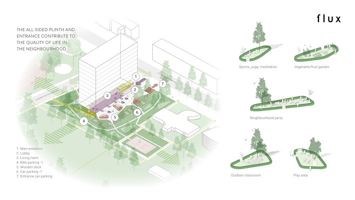 Flux Landscape Architecture heeft de buitenruimte ontworpen. In het plan staan waterberging, collectiviteit en zicht aan alle zijdes centraal. Door De Baak in te bedden in het landschap wordt de aanwezigheid van het park versterkt en de versnippering omgezet naar meer eenheid. Er ontstaat een logisch geheel dat toont hoe bebouwing en park met elkaar samengaan in de Westelijke Tuinsteden.