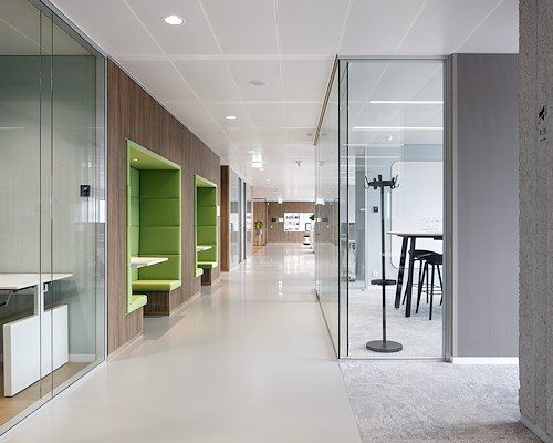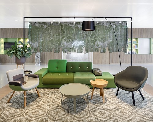 De inrichting van de kantooromgeving is gebaseerd op de principes van ‘Het Nieuwe Werken’. Er is een neutrale, open generieke kantooromgeving gerealiseerd waarin medewerkers een flexibele werkplek hebben. Ontmoeting staat centraal binnen dit kantoorconcept. Elke verdieping heeft een eigen community gebied met karakter. Waar de kantooromgeving neutraal en tijdloos is, is het ontmoetingsgebied juist kleurrijk en dynamisch.