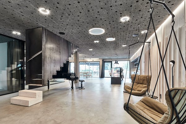 Huis Lui is hier een perfect voorbeeld van. Comfortabele gestoffeerde stoelen en fauteuils, leren banken en hangstoelen in discrete kleuren en verschillende designs worden gecombineerd met lichte stenen vloeren en tapijten en benadrukken de huiselijke en persoonlijke sfeer in de nieuwbouw. De plafondpanelen in naturel grijs, met hun maatwerk perforaties, zijn perfect afgestemd op het totaalconcept en vormen een belangrijk en opvallend designelement.