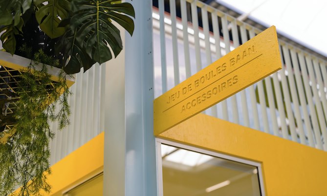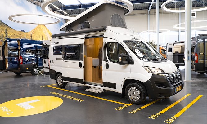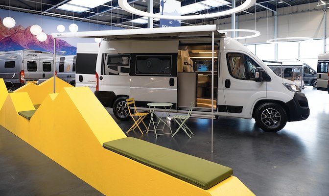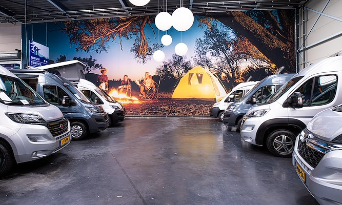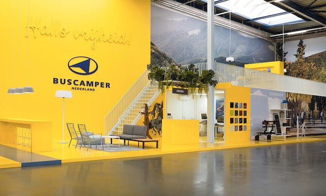 De nieuwe showroom staat in het teken van vakantie, zorgeloos op avontuur, service en ontspanning. Bezoekers van de showroom meanderen tussen de buscampers door, drinken een drankje aan een picknicktafel, laten zich informeren op het serviceplein, rusten uit onder een olijfboom of spelen een potje jeu de boules. Laat het avontuur maar beginnen!