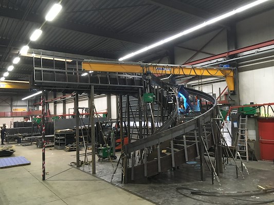 De 8-tons trap stijgt in een enkele spiraalvormige curve die vervolgens recht wordt in een lange cantilever die aansluit op het mezzanineniveau. De precisie en sterkte van de structuur betekende dat er slechts twee bevestigingspunten nodig waren - één aan de basis en één waar het aansluit op de mezzaninestructuur. De stalen structuur van de trap is gemaakt in vier segmenten, die in twee dagen zijn geplaatst door het EeStairs-team.