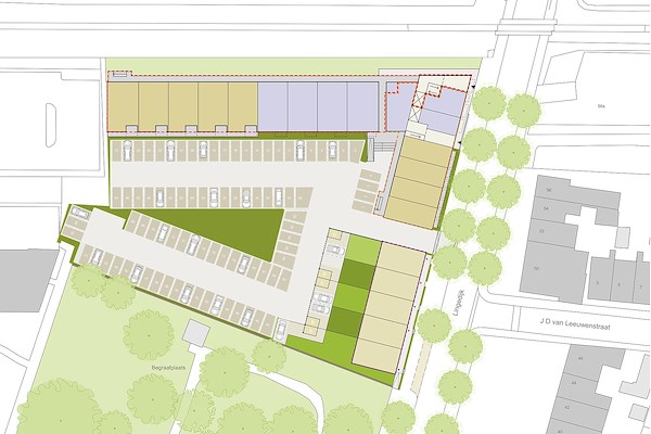 Vanaf de Lingedijk is via een inrit tussen beide bouwblokken door een binnenterrein toegankelijk waar door de bewoners geparkeerd kan worden. Dit terrein wordt omsloten door beide bouwblokken en de bestaande monumentale muur van de begraafplaats. Het merendeel van de appartementen is met de woonkamer en het balkon op deze ruimte georiënteerd waardoor de sociale controle is gewaarborgd.