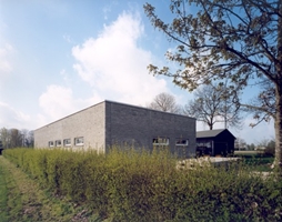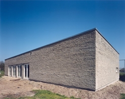 Ontwerp Het gebouw is ontworpen als een fort in het open veld: rechthoekig, 24 meter lang, 10 meter breed en 4 meter hoog. Ondanks de beperkte omvang probeert het de omliggende sportvelden te domineren. Verschillende architectonische hulpmiddelen zijn gebruikt om dit effect te versterken. Zo is de gevel opgebouwd uit gebroken stoeptegels. Zij geven het gebouw een ruwe, harde uitstra-ling. Verder oogt het gebouw 'opgetild' door het toepassen van een teruggelegde plint van gladde tegels. Ter plaatste van de vier dubbele deuren wordt de plint tot aan de bovenkant van de kozij-nen doorgetrokken. Loopbruggen vormen de entree, waardoor het gras rond het gebouw loopt, als een gracht met ophaalbrug. Ramen zijn laag en breed met een diepe negge (als schietgaten). Het buitenspouwblad is gemetseld van ca. 10.000 gebruikte betontegels (een schoolplein van 30 x 30 meter: schoongemaakt, gebroken en verwerkt met dunbedmortel). Ook het interieur heeft een stevige uitstraling: wanden zijn opgetrokken uit diverse kleuren met-selwerk. Het dak zit hoog en wordt gedragen door zware houten spanten. De indeling van het ge-bouw is eenvoudig: de ene helft is kantine de andere helft bevat service ruimten (hal, toiletten, keuken, bijkeuken en materialenberging). Het metselwerk van het binnenspouwblad bestaat uit restpartijen gevelstenen in diverse kleuren.